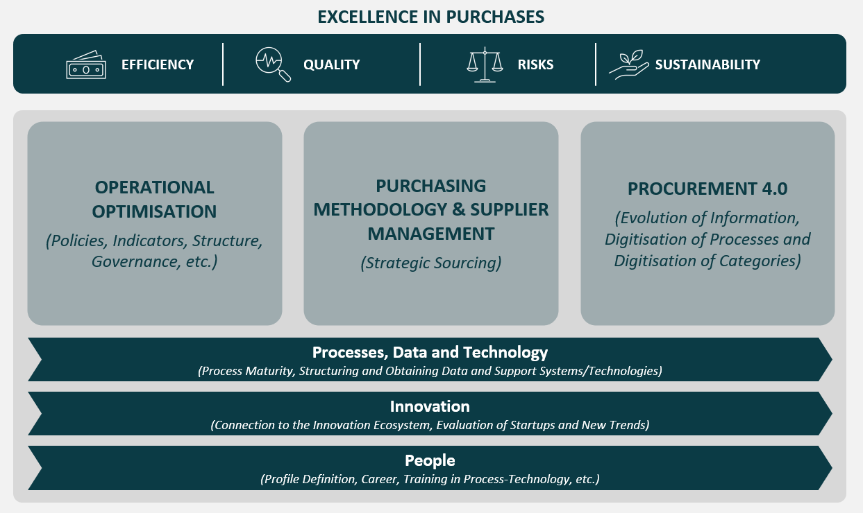 Visagio has a proven success with efficient procurement strategies, delivering benefits through operational optimisation, strategic supplier management, and digital transformation (Procurement 4.0). These methodologies not only drive cost savings and efficiency but also strengthen supplier relationships, positioning businesses for sustained growth and competitiveness. Through these methods, we improve processes by streamlining operations and eliminating inefficiencies, enhance data and technology by leveraging advanced analytics and automation, foster innovation by adopting cutting-edge procurement solutions, and empower people through continuous training and development.
