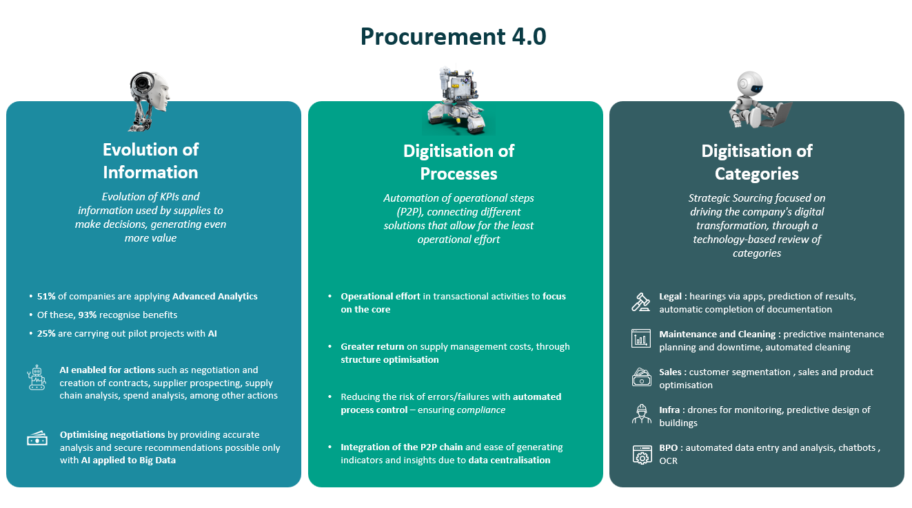 Procurement 4.0 represents the next evolution in procurement practices, driven by the integration of advanced information technologies and the digitalisation of processes and categories. This transformative approach leverages big data, artificial intelligence, and machine learning to revolutionise how procurement functions. The evolution of information technologies has enabled organisations to access real-time data and insights, enhancing decision-making and strategic planning. Digitisation of processes streamlines procurement activities, automating routine tasks such as purchase order processing, thus improving efficiency and reducing errors. Additionally, the digitalisation of categories allows for more precise and agile management of sourcing and supplier relationships, ensuring that procurement strategies are adaptable and responsive to market dynamics. By embracing Procurement 4.0, businesses can achieve greater transparency, agility, and competitiveness in their procurement operations.
