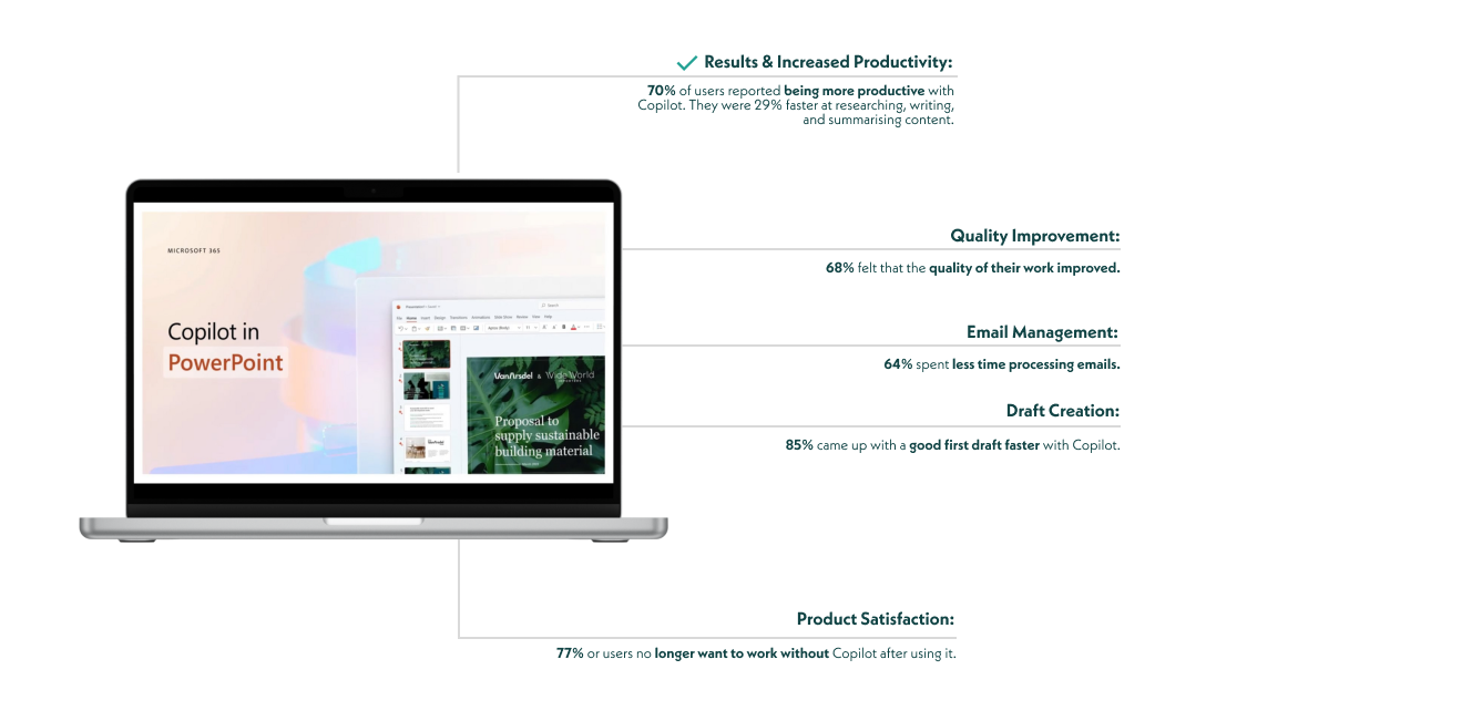 One example of an application is the Microsoft 365 Copilot, an assistant integrated into Office products for businesses that enables automatic content generation from conversations with the assistant and reading company files. 70% of users reported being 29% more productive when using Copilot to research, write and summarise content.