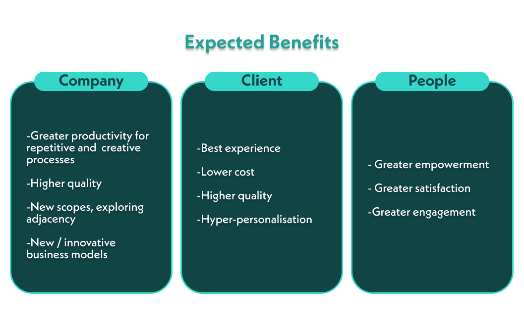 For the company, generative AI can automate routine tasks, streamline processes, and provide insights through data analysis, leading to greater productivity and higher-quality outputs. It also opens up new business models by enabling rapid prototyping and innovation. For clients, generative AI offers a more personalised and cost-effective experience. It can tailor products and services to individual preferences, improve customer support through intelligent chatbots, and reduce operational costs, ultimately enhancing customer satisfaction. For employees, generative AI fosters a more empowered and satisfying work environment. It can take over mundane tasks, allowing employees to focus on more strategic and creative endeavours, thus increasing their engagement and job satisfaction.