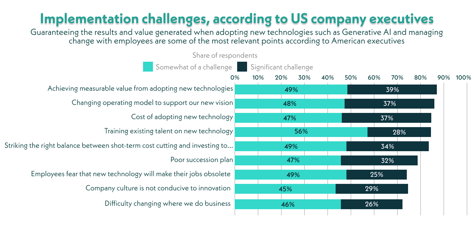 Understanding how urgent it is to pay attention to Gen AI is only the beginning of the journey, and companies can face many challenges during the implementation. A survey conducted with US business executives regarding the integration of new technologies into their businesses reveals that one of the primary adoption challenges is ensuring the results and value generated by technologies such as generative AI. Additionally, managing change with employees is highlighted as one of the most relevant concerns, along with the costs of adopting a new technology.